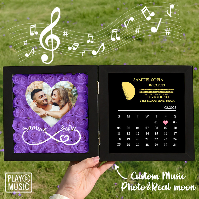 Marco De Rosas Personalizado Con Fase Lunar Real. Puede Reproducir Música. Calendario De Aniversario. Regalo Para Ella.